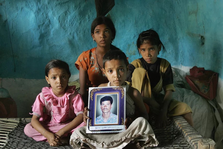Portrait of the Indian cotton farmer Neelkhant Haste held by his four daughters in Yavatmal, after he died by consuming insecticide. | Sebastian D’Souza/AFP/Getty Images